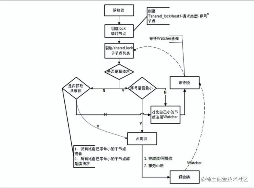 - 如果应用是读操作,判断它是不是最小的节点,如果是最小的节点或者比它小的都是读节点,就获取锁成功。否则向比自己序号小的最后一个写节点注册监听。