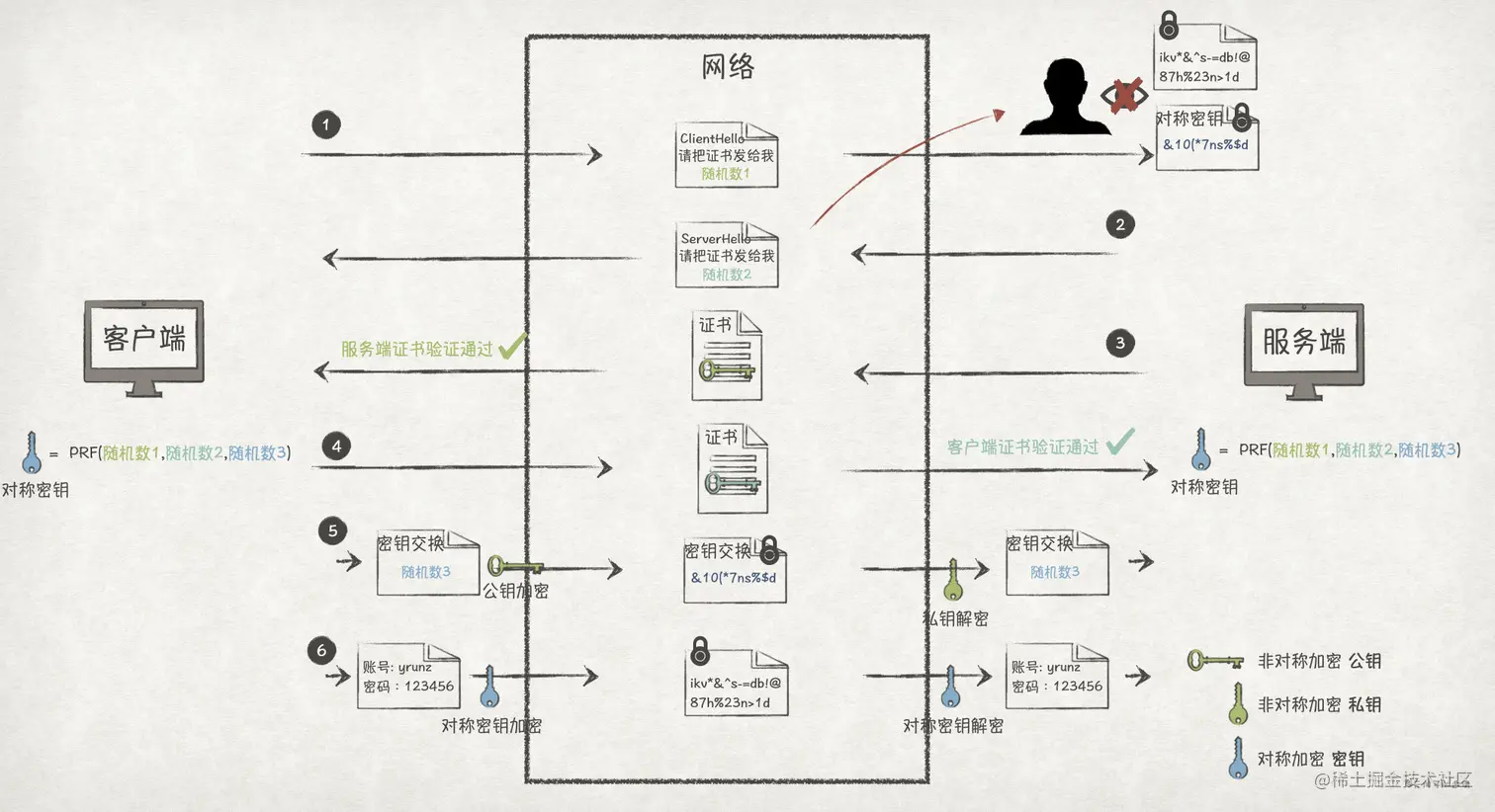 随机数1和随机数2是明文传输,但随机数3是密传输,也就能够保证攻击者很难破解到密钥。
