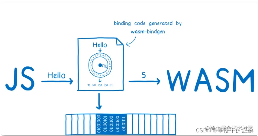 wasm-bindgen 的核心是促进 javascript 和 Rust 之间使用 wasm 进行通信。它允许开发者直接使用 Rust 的结构体、javascript的类、字符串等类型,而不仅仅是 wasm 支持的整数或浮点数类型。