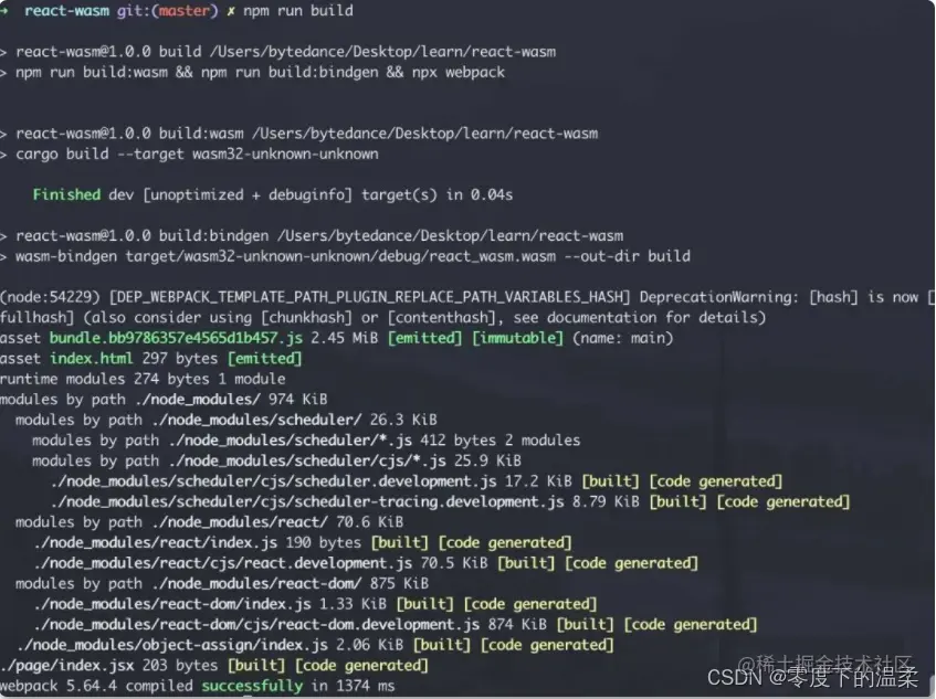 下面,执行一下这几个命令:npm run build:wasm、npm run build:bindgen、npm run build,应该都不会报错。