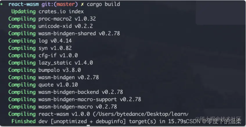 安装后,我们可以使用 Rust 生成的 WebAssembly 给我们的 React 代码创建一个包:
