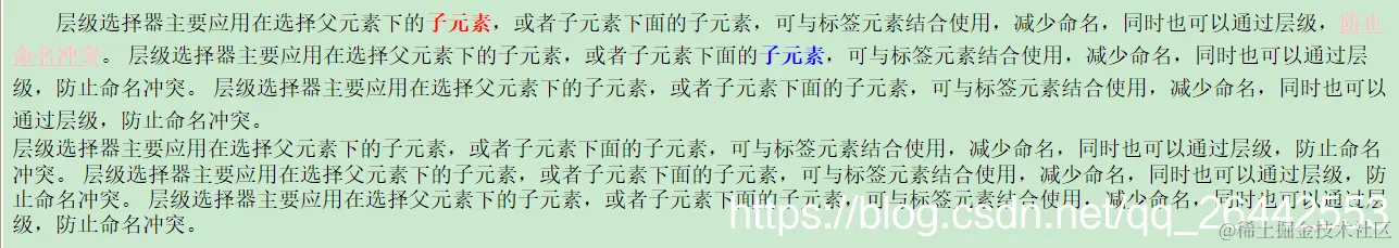 层级选择器主要应用在选择父元素下的子元素,或者子元素下面的子元素,可与标签元素结合使用,减少命名,同时也可以通过层级,防止命名冲突。