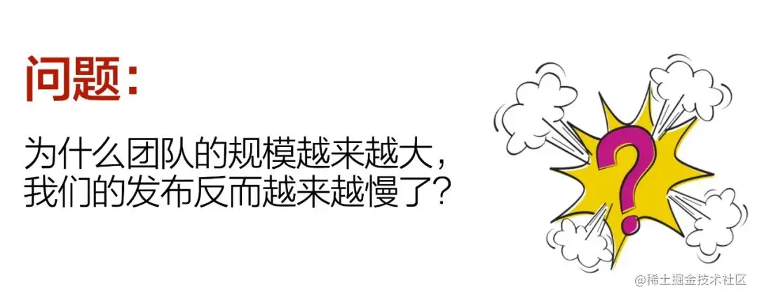 站在团队的角度来说,因为人多,协作越来越慢,协作的成本也越来越高。我们发现团队的研发模式,人越多越会有问题,因为冲突更多,等待更多。这里冲突是指代码集成发布过程中的冲突,而等待也是集成和开发过程中代码彼此的等待。