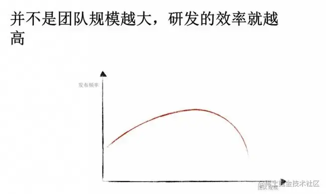 这个时候悖论就来了:我们以为团队规模越大,研发效率就会越高,可以做越多的东西,但是我们发现团队规模大到一定程度,整个研发效率是会下降的,甚至降得非常快。