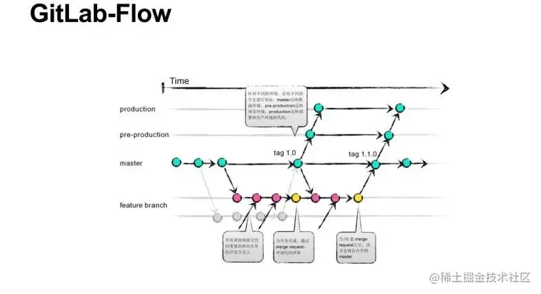 GitLab—Flow和GitHub—Flow区别是在发布过程中有了Pre-production分支和Production分支,基于开发、集成和发布过程中不同的环境分配了相应的分支。