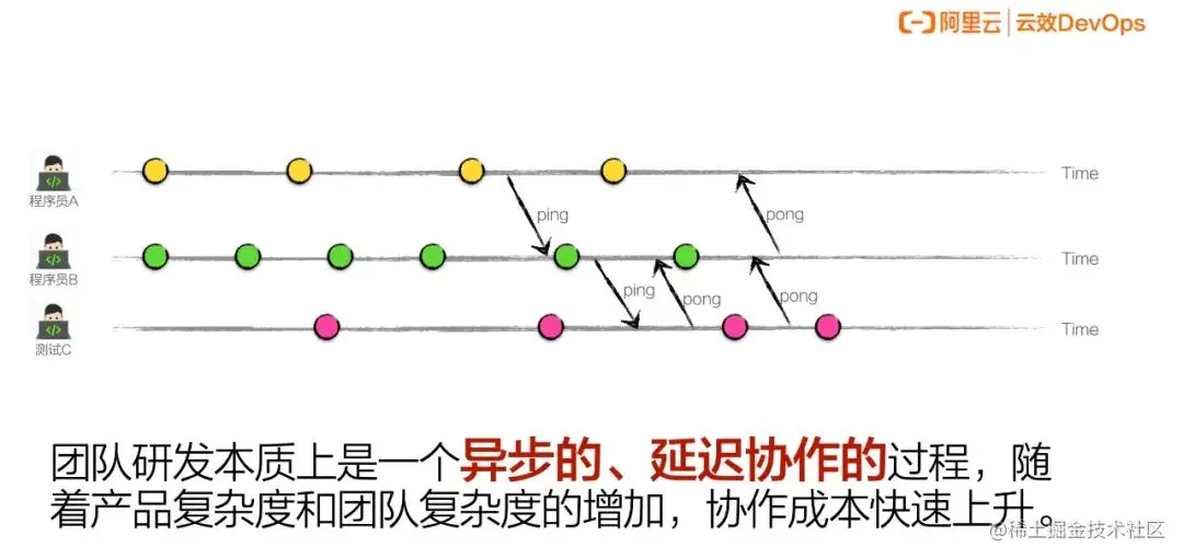 我们发现,程序员和程序员,测试人员和开发人员之间,在整个的开发协作中其实是异步的、延迟协作的过程。每个人并不是收到一个请求就马上回复,马上协作,往往都是有自己的步调和自己的动作,可能会产生延迟。所以当产品更复杂,协作更多,团队更复杂,团队的人多了以后,协作成本就会快速上升。