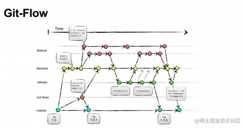 Git—Flow的基本原则是需要什么分支就给什么分支,任何事都有很明确的分支。比如说要集成,就有develop分支,要开发就有feature分支,要发布有release分支,每个都是不同的分支。每种类型的分支都有确定的用途。