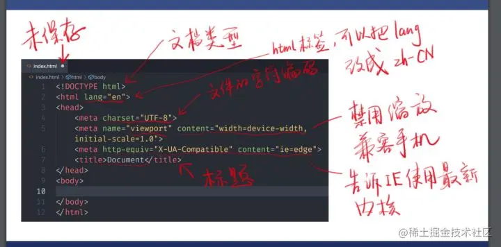 ii、 HTML 起手式的意思是,写 HTML 时所必须的基本格式, 它包括文档类型,字符集编码,语言以及浏览器兼容等。一般在使用编译器的时候,可以通过! + Tab一键配置 HTML 的基本格式,如下图所示: