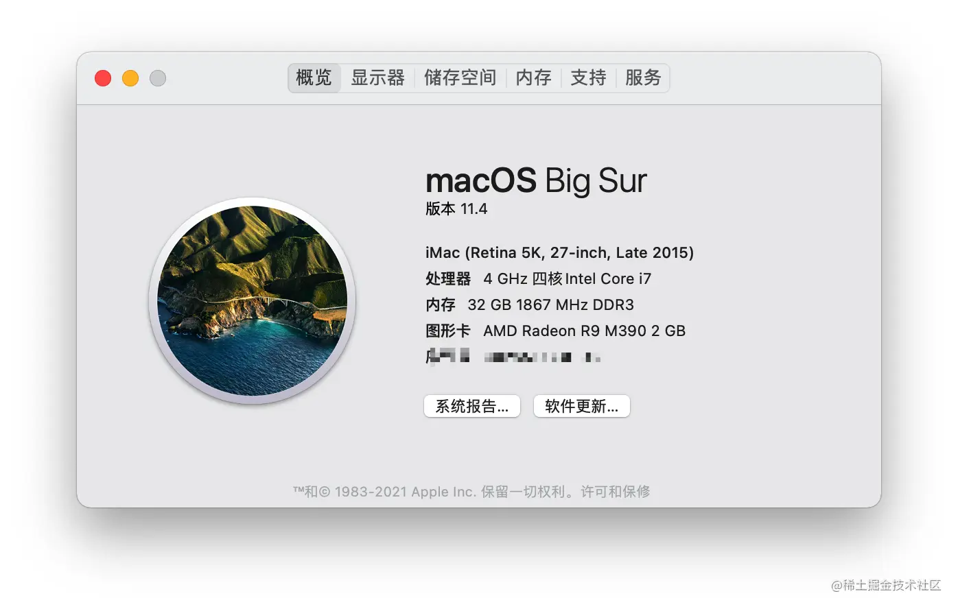 这是我本机的配置情况,早年买的顶配 iMac,也是我的主力机。一开始只有 16 G 内存,后来加了一个 16 G 内存条,不过最近半年电脑突然死机重启的频率明显提高了,不知道是不是 Big Sur 这个操作系统的问题还是电脑硬件老了。