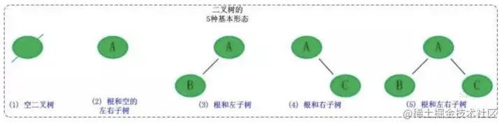 二叉树是每个节点最多有两个子树的树结构。它有五种基本形态:二叉树可以是空集;根可以有空的左子树或右子树;或者左、右子树皆为空。