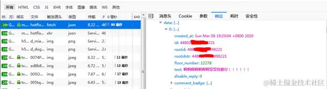 接下来小编又选择微博的移动端网站,先登录,然后找到我们想要抓取评论的微博,打开浏览器自带流量分析工具,一直下拉评论,找到评论数据接口,如下图所示。