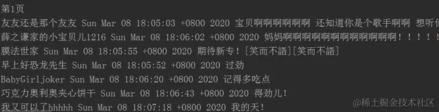 3、然后将返回数据转换成json格式,取出评论内容、评论者昵称和评论时间等数据,输出结果如下图所示。