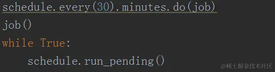 7、这里把函数命名为job。为了能够一直取出最新的数据,我们可以用schedule给程序加个定时功能,每隔10分钟或者半个小时抓1次,如下图所示。