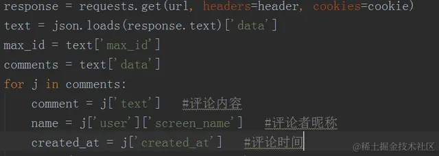 可以看到总共有4个参数,其中第1、2个参数为该条微博的id,就像人的身份证号一样,这个相当于该条微博的“身份证号”,max_id是变换页码的参数,每次都要变化,下次的max_id参数值在本次请求的返回数据中。