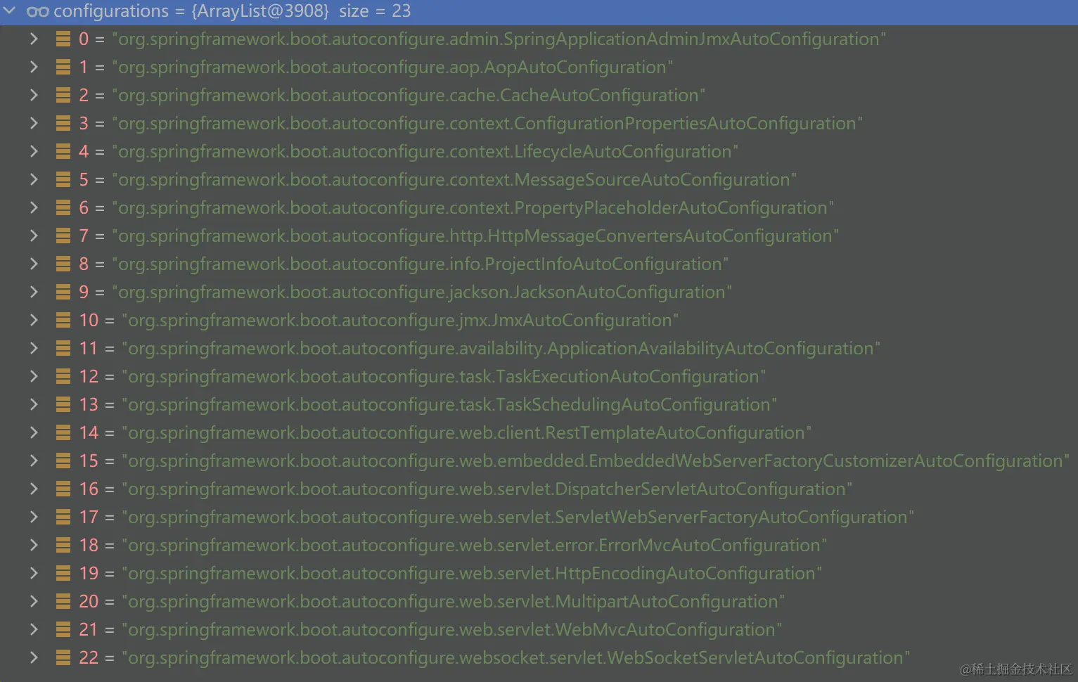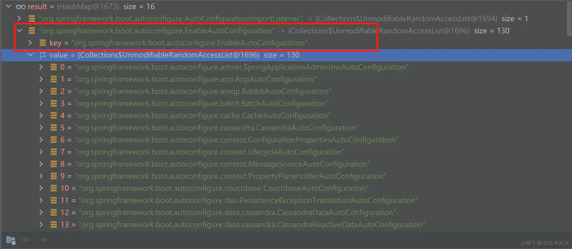 loadFactoryNames方法只是传递一个org.springframework.boot.autoconfigure.EnableAutoConfiguration作为key,然后取到对应的自动配置类列表。 最终调用的是loadSpringFactories方法,loadSpringFactories会从jar包中找到spring.factories文件然后将其中的自动配置类存到一个map中,从下图可以看到map中存在很多bean,loadFactoryNames方法在加载自动配置类时只取了一个key。弱水三千,只取一瓢。