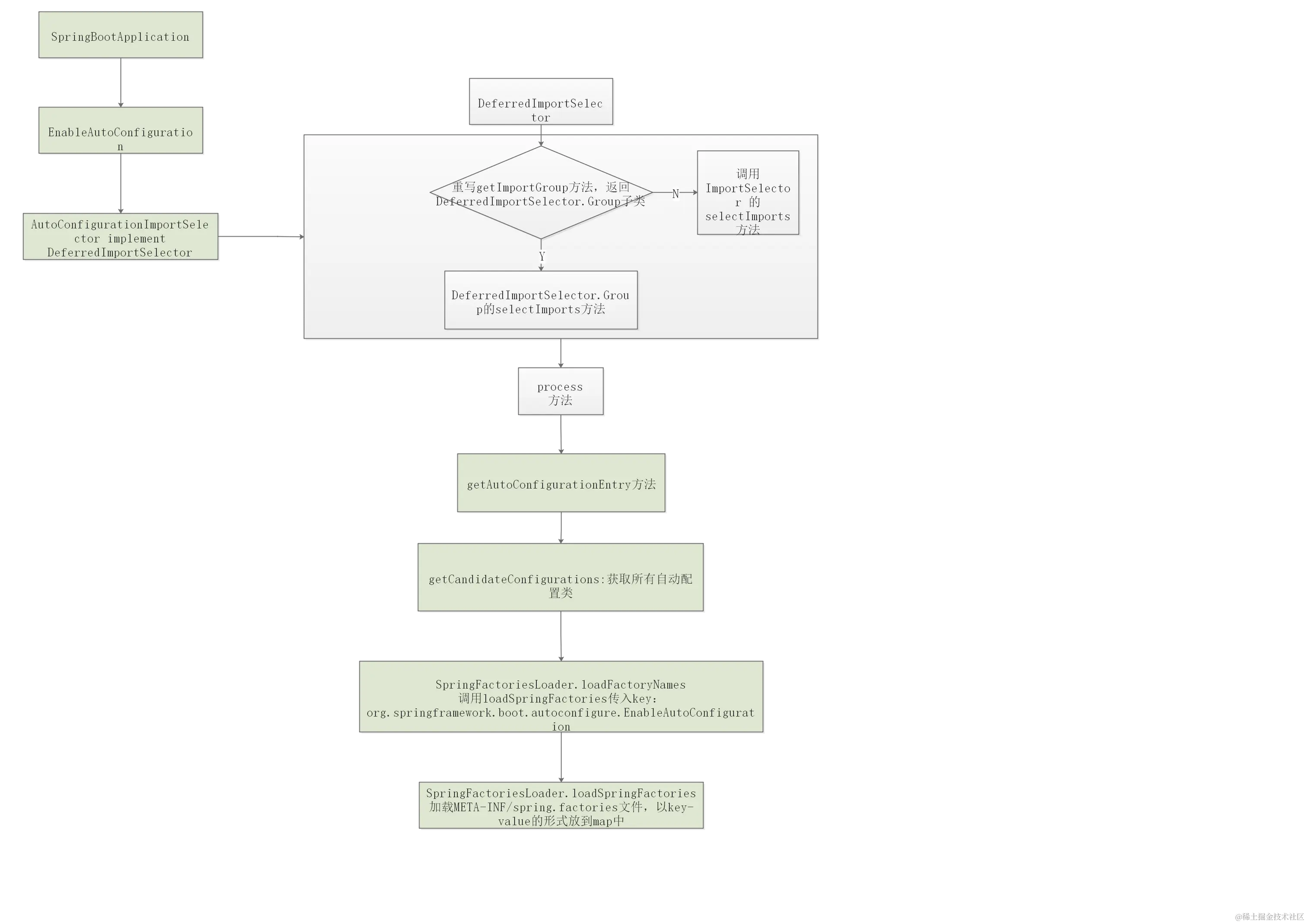 - AutoConfigurationImportSelector实现DeferredImportSelector接口,并重写了getImportGroup方法并返回AutoConfigurationImportSelector.AutoConfigurationGroup,AutoConfigurationImportSelector.AutoConfigurationGroup.process开始处理自动配置流程。