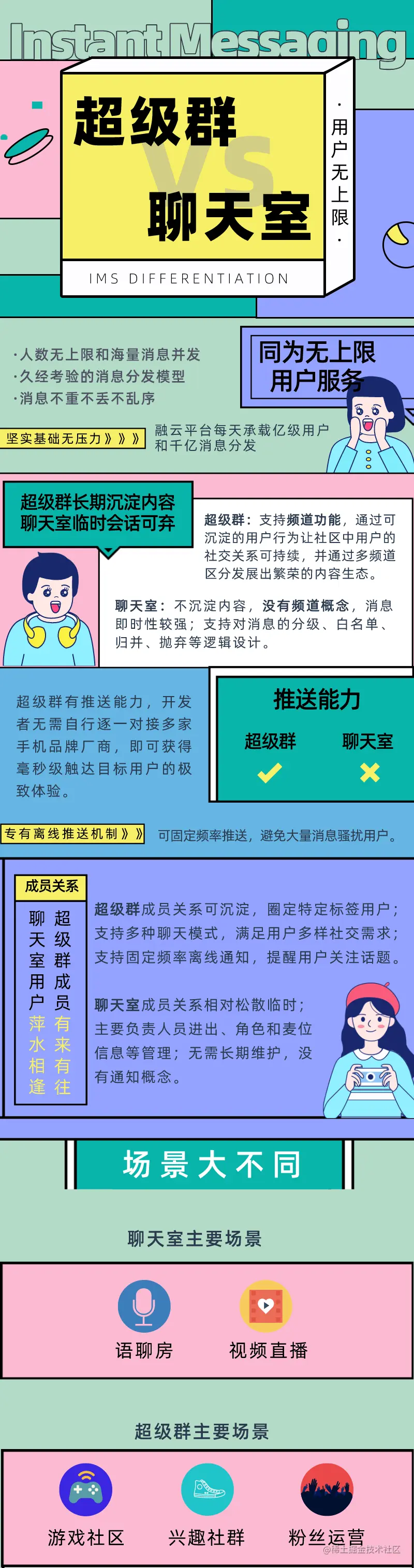 聊天室和超级群都承载无限用户,但二者面对完全不同的场景挑战。