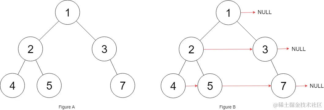 填充它的每个 next 指针,让这个指针指向其下一个右侧节点。如果找不到下一个右侧节点,则将 next 指针设置为 NULL。