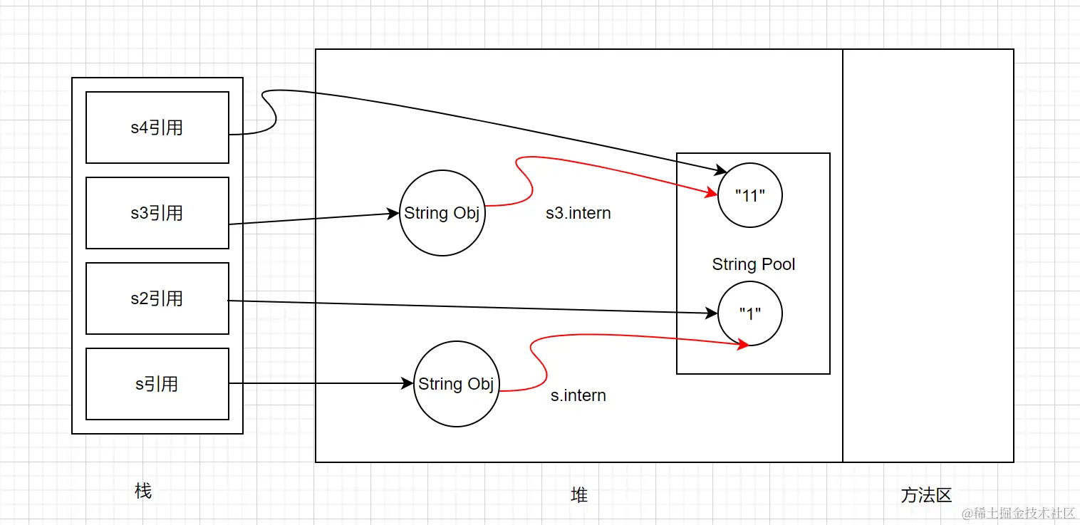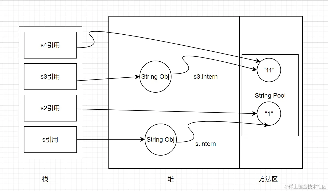 String.intern方法时,如果存在堆中的对象,会直接保存对象的引用,而不会重新创建对象。