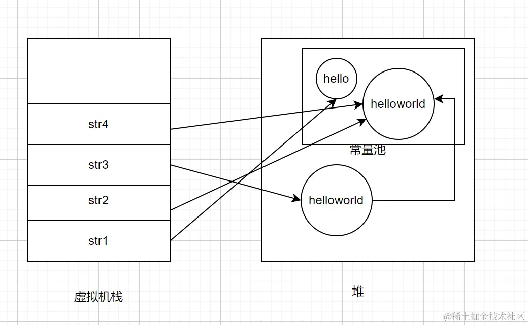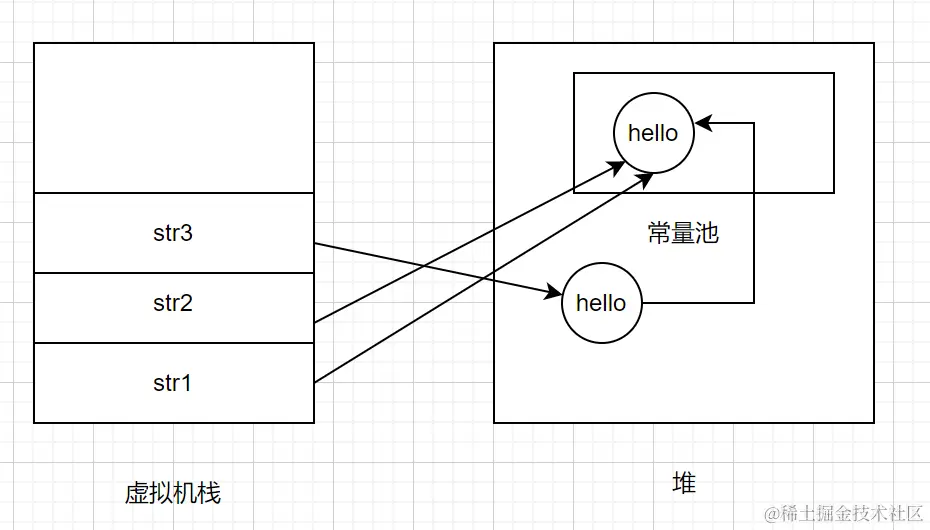 对于上面情况,首先String str1 = "hello",会先在常量池检查是否有hello存在,发现是不存在的,则在常量池中创建hello对象,并将常量池中的引用赋值给str1;紧接着String str2 = "hello",在常量池中检测到有hello,所以讲常量池中的引用赋值给str2,所以str1 == str2是true;紧接着String str3 = new String("hello"),常量池中有了hello,所以不用在常量池中创建,然后在堆中创建该对象并将对象的引用赋值给str3,再将该对象指向常量池。如下图所示:
