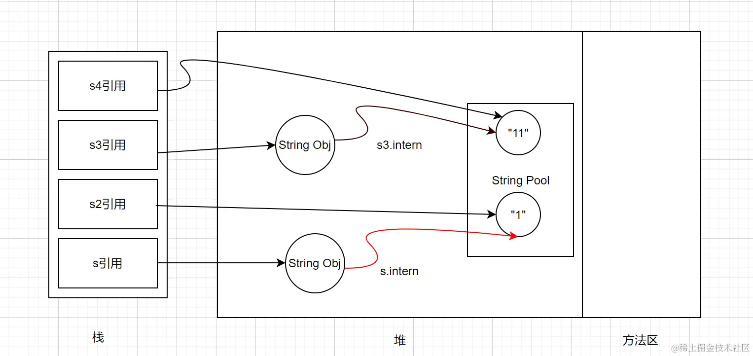 s.intern();这行代码往后执行不会有什么影响,因为"1"在常量池中已经存在了,所以s和s1的引用对象是不同的。 - 再看s3和s4,区别就是
