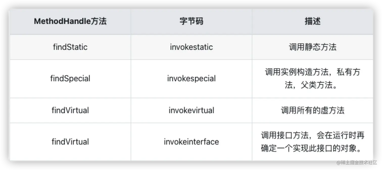 通过上述演示,我们发现当使用方式二时,用户需要区分具体的调用类型,比如说对于用 invokestatic 调用的静态方法,我们需要使用 Lookup.findStatic 方法;对于用 invokevirtual 调用的实例方法,以及用 invokeinterface 调用的接口方法,我们需要使用 findVirtual 方法;对于用 invokespecial 调用的实例方法,我们则需要使用 findSpecial 方法。