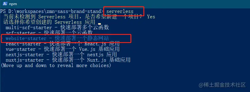 命令行输入serverless,然后选择website-starter - 快速部署一个静态网站,也可以生成配置文件信息,但是上面提到的入口src一定要改成./public。