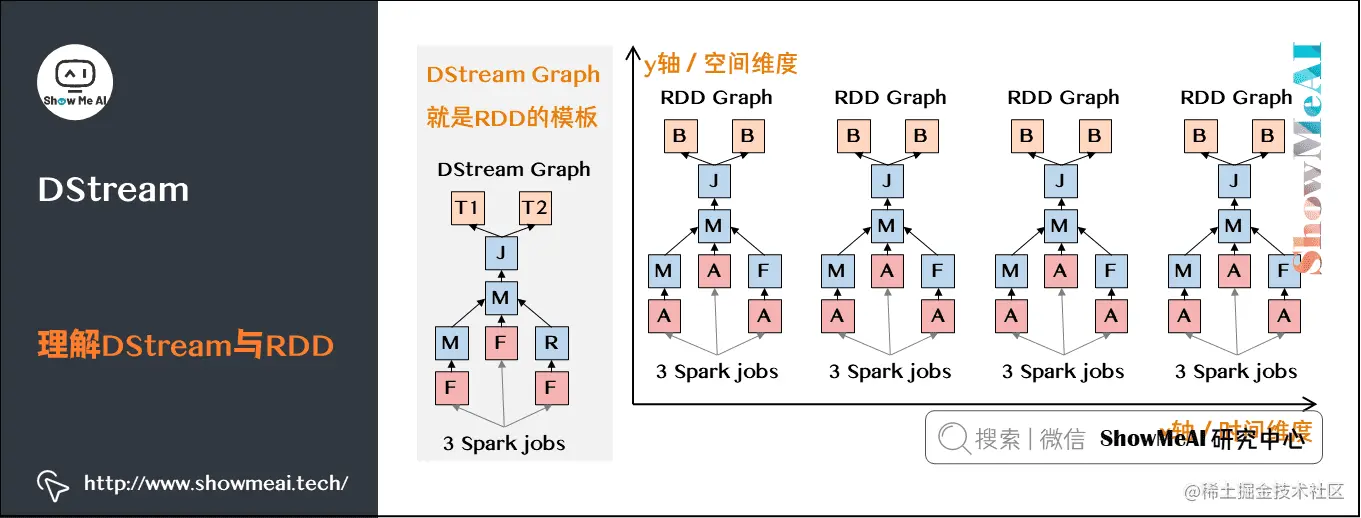 - 空间维度:代表RDD依赖关系构成的具体的业务逻辑的处理步骤,用DStreamGraph表示