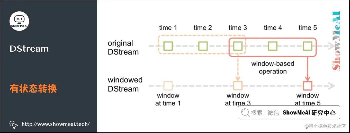 Window Operations 有点类似于 Storm 中的 State,可以设置窗口的大小和滑动窗口的间隔来动态的获取当前Steaming 的允许状态。