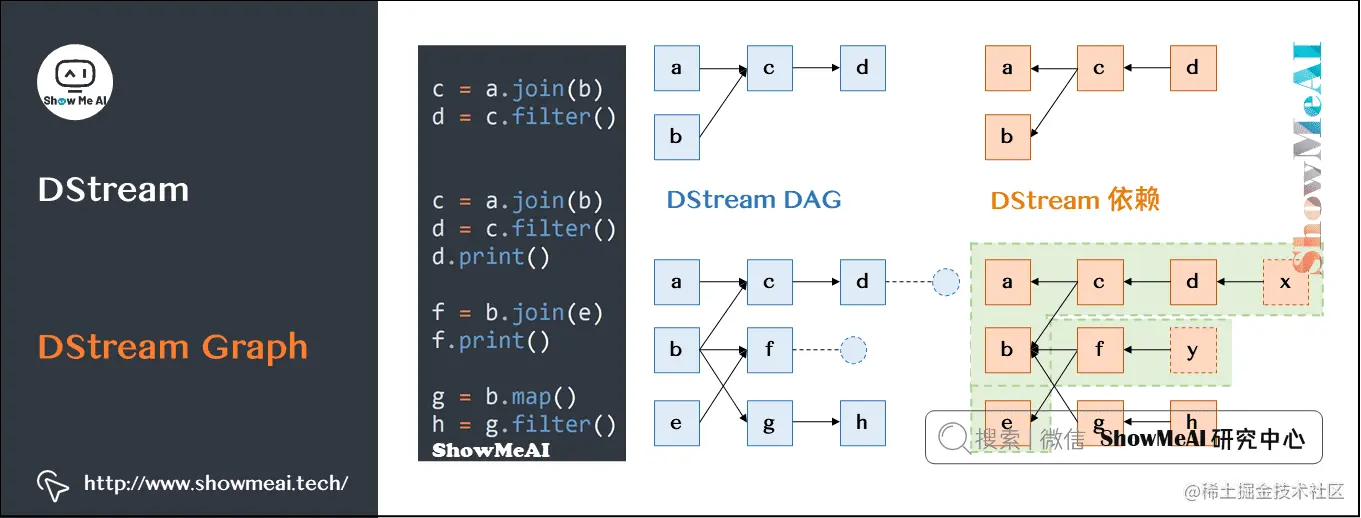 c = a.join(b), d = c.filter() 时, 它们的 DAG 逻辑关系是a/b → c,c → d,但在 Spark Streaming 在进行物理记录时却是反向的 a/b ← c, c ← d, 目的是为了追溯。