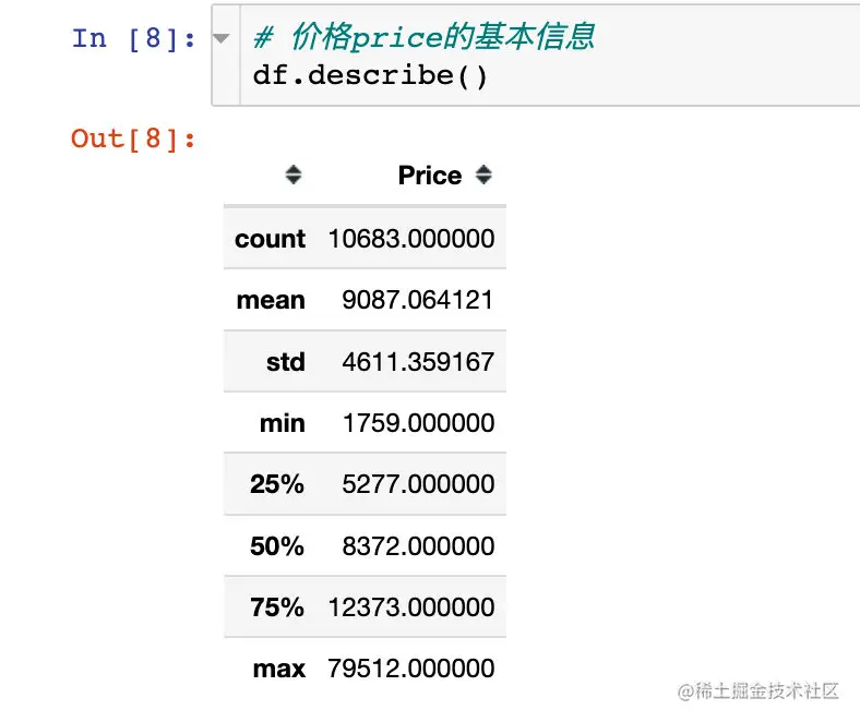 数值型字段的描述统计信息,这里主要是针对Price字段: