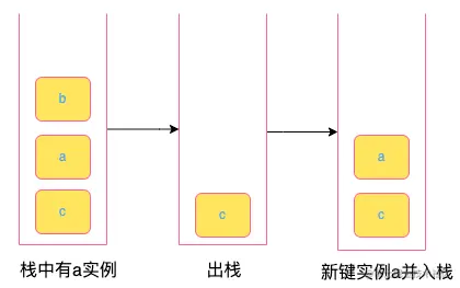 这里需要注意的是,当目标Activity的启动模式是standard时,系统会将目标Activity实例以及位于它上面的Activity实例全部出栈,然后再新建一个Activity实例放入栈中,如下图所示。