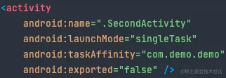 讲解该模式之前,需要介绍属性taskAffinity,如下图所示,与launchMode 一样,taskAffinity也是定义在AndroidManifest文件中的Activity属性,它的作用是指定Activity被创建时想被放入的栈,该栈的名字必须有“com. . ”类似于包名的格式,此外,由于应用的默认栈的名字就是包名,该栈名字要和包名不同,不然意义不大。