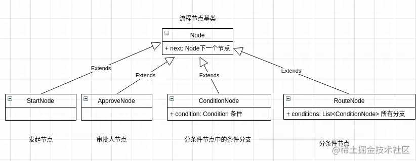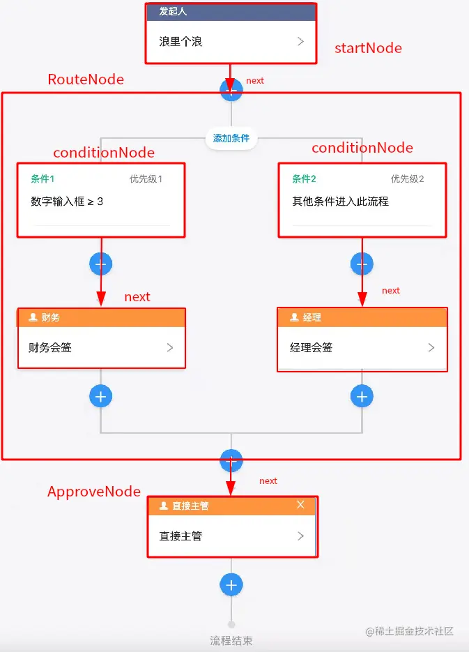 RouteNode 除了像普通节点一样通过 next 连接下一个节点,其中包含的每个 condition 又是一个完整的流程配置(递归定义),由此可见审批节点模型是复杂的嵌套结构。