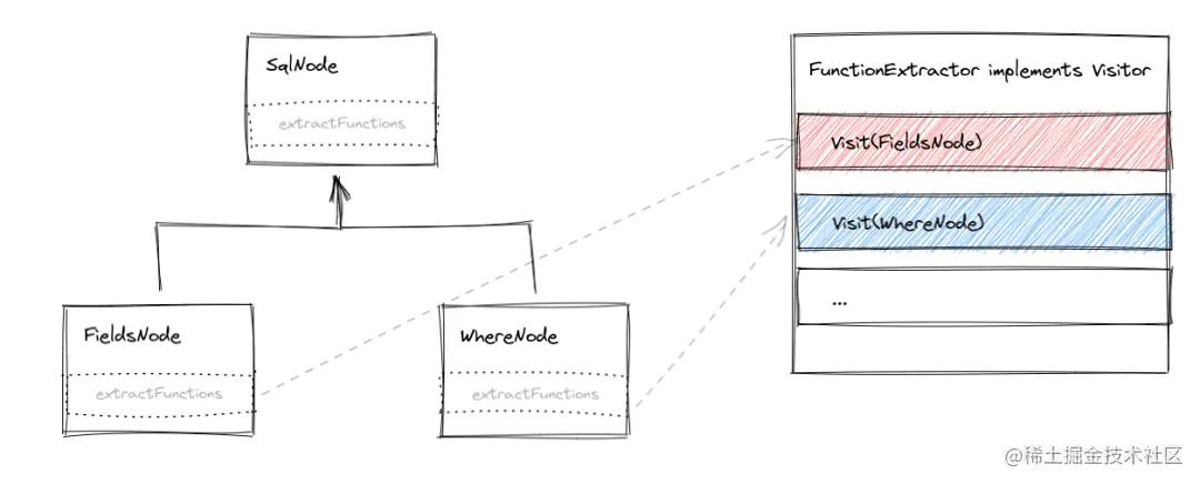 对比一下第二小节的代码,最大的区别就是 sqlNode.accept(visitor) 被换成了对 extractFunctions 的递归调用。另外就是原本通过类来封装的行为,变成了更加轻量的函数。我们将在下一小节探讨其更加深入的含义。