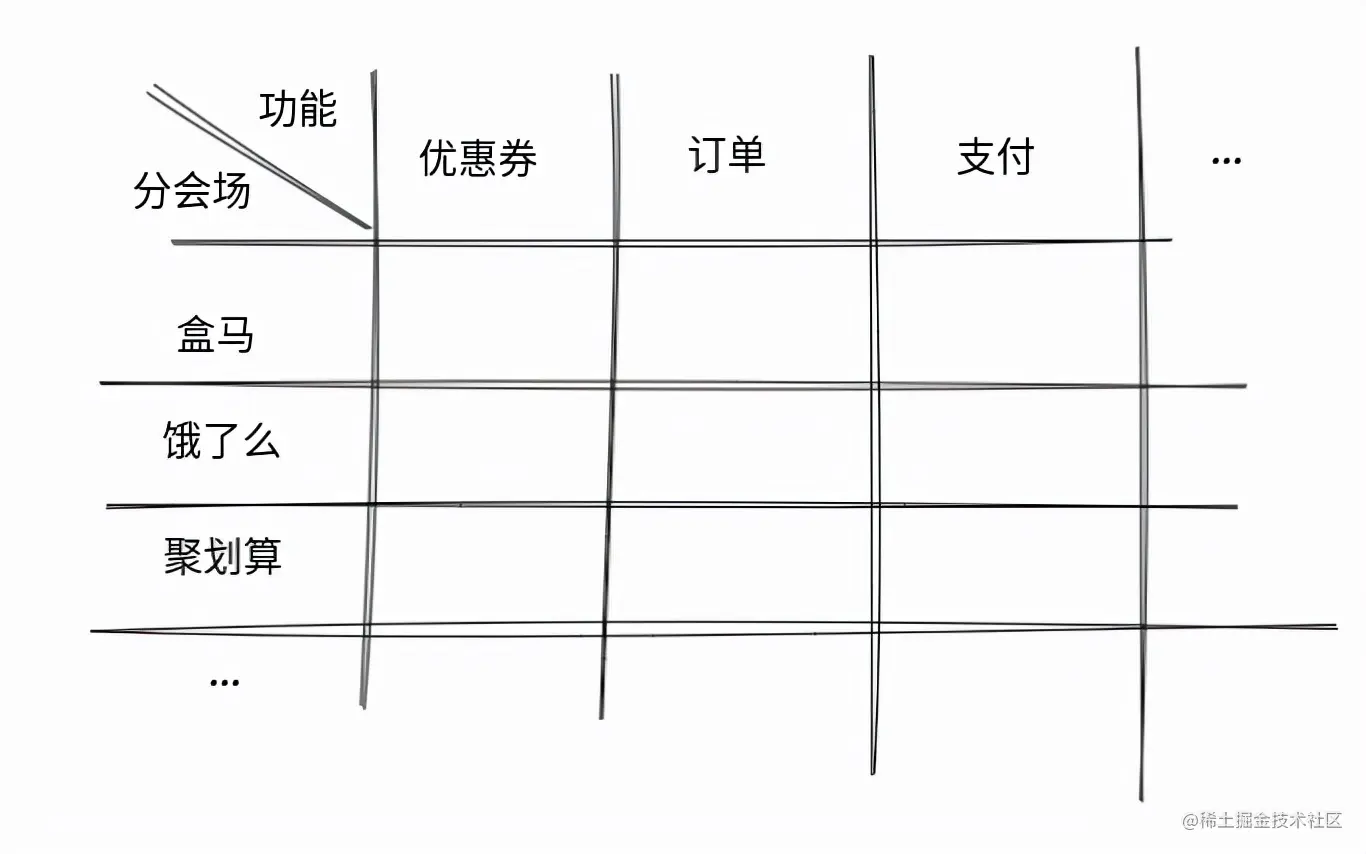 这两个场景对应了软件的两种拆分方式,一种是按照数据拆分,一种是按照功能点拆分,以阿里双十一的各个分会场与功能为例:盒马,饿了么和聚划算分别作为一个分会场参与了双十一的促销,他们都需要提供优惠券,订单和支付等功能。