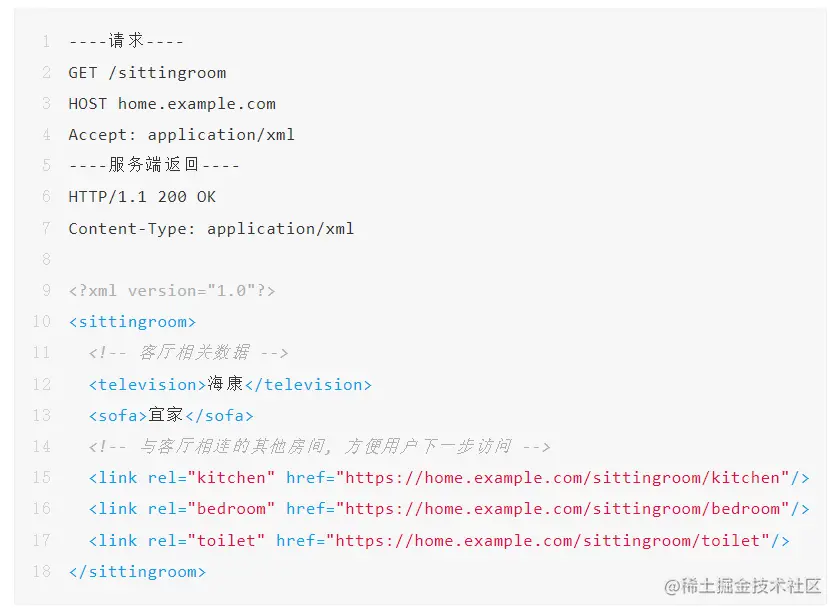 这在实际中的应用就是 HATEOAS (Hypermedia as the Engine of Application State),HATEOAS 风格的 HTTP 接口除了会返回用户请求的数据外,还会包含用户下一步应该访问的 URL,如果将整个应用的 API 比作一个家的话,假如用户请求客厅的数据,那么接口除了返回客厅的数据外,还会返回与客厅相连的 "厨房",“卧室”与“卫生间”的 URL: