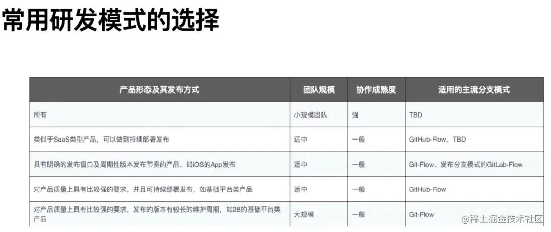 研发模式的选择与产品形态、发布方式、团队规模、协作成熟度密切相关。比如团队规模很小,协作成熟度很高,就直接用主干开发。类似于Web服务端的开发,可以做到持续部署,可以选择GitHub—Flow,或者是TBD。