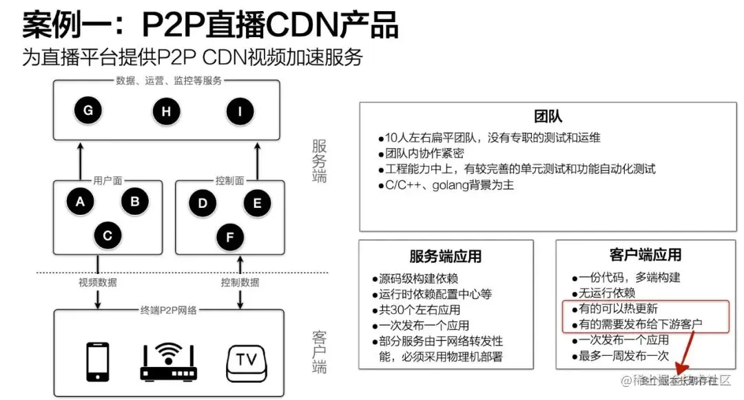 第一个案例是P2P直播CDN产品,左边是它的架构图,分为一个客户端和一个服务端。客户端是有多端的,比如手机、路由器、机顶盒等,每一种端的发布形式是不一样的。终端,客户端和服务端之间有两条通信链路,一条是视频数据的链路,另外一条是控制数据的链路。
