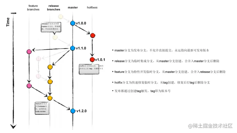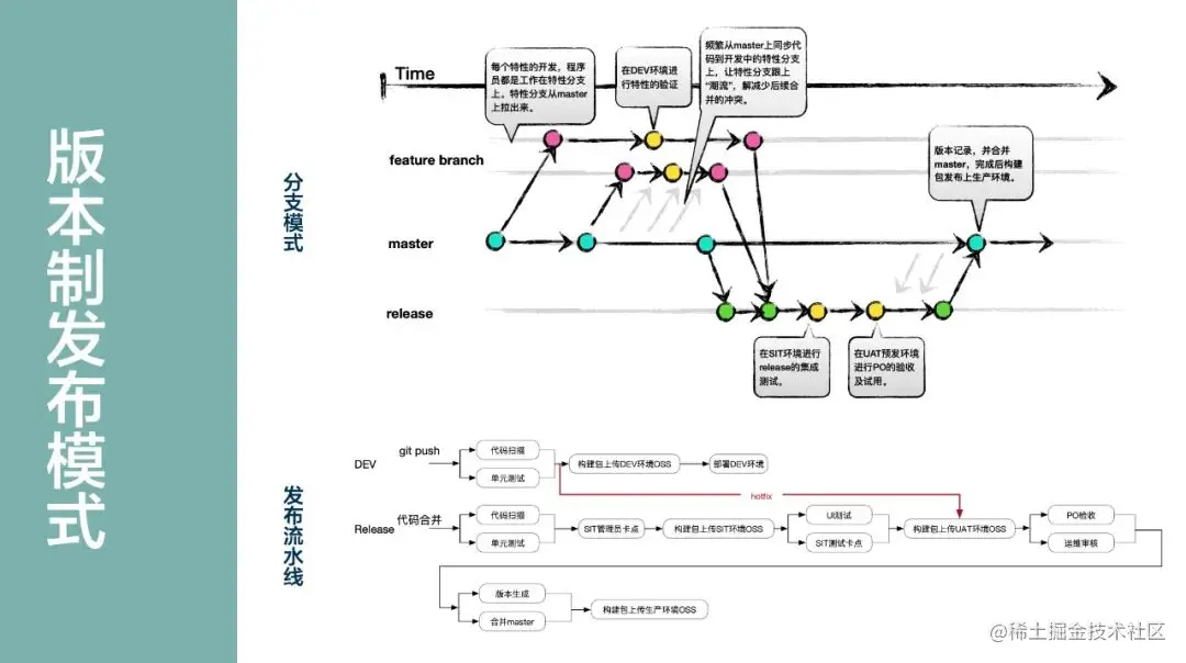 这个产品的release分支会更长,它的版本需要固定下来,要有明确的Tag。所以Master不能直接提交,永远指向最后一个已发布的版本,但是整个开发其实是拉release去做,这个release可能会比较久。