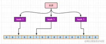 布隆过滤器算法主要思想就是利用 n 个哈希函数进行 hash 过后,得到不同的哈希值,根据 hash 映射到数组(这个数组的长度可能会很长很长)的不同的索引位置上,然后将相应的索引位上的值设置为1。
