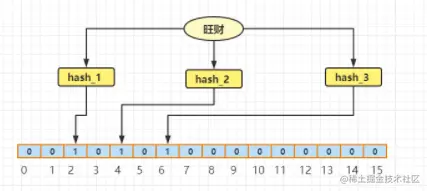 旺财经过三次 hash 过后,值分别为2,4,6 那么根据可以得到索引值分别为 2、4、6,于是就将该数组的索引(2、4、6)位置的值置为1,其余当做是0,现在假设需要查找旺财 ,同样经过这个三个hash 然后发现得到的索引 2、4、6对应的位置的值都为1,那么可以判断旺财可能是存在的。