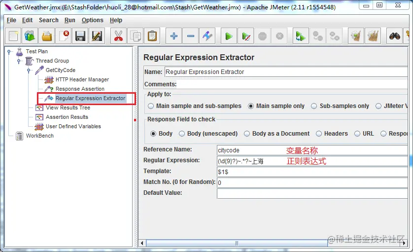${citycode} 中的数据, 是从Regular Expression Extractor 中取来的