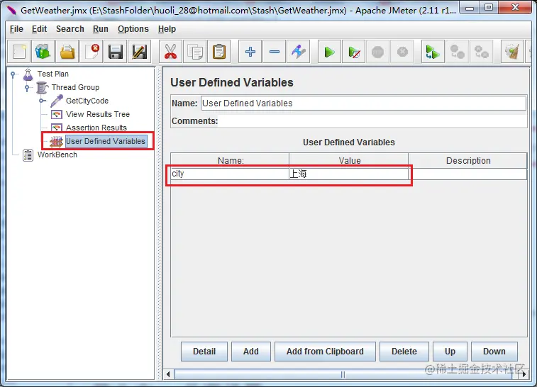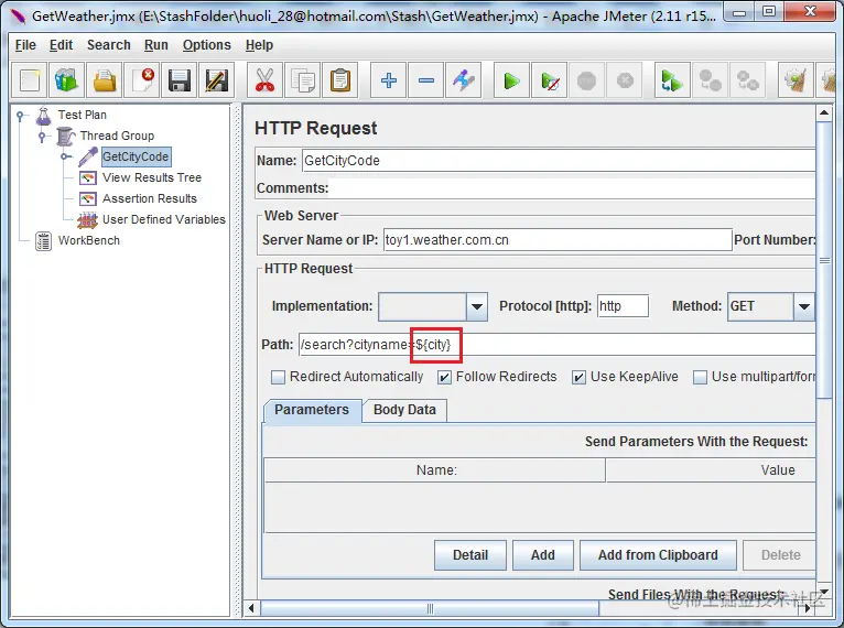 我们还可以在Jmeter中定义变量。 比如我定义一个变量叫 city. 使用它的时候用 ${city}