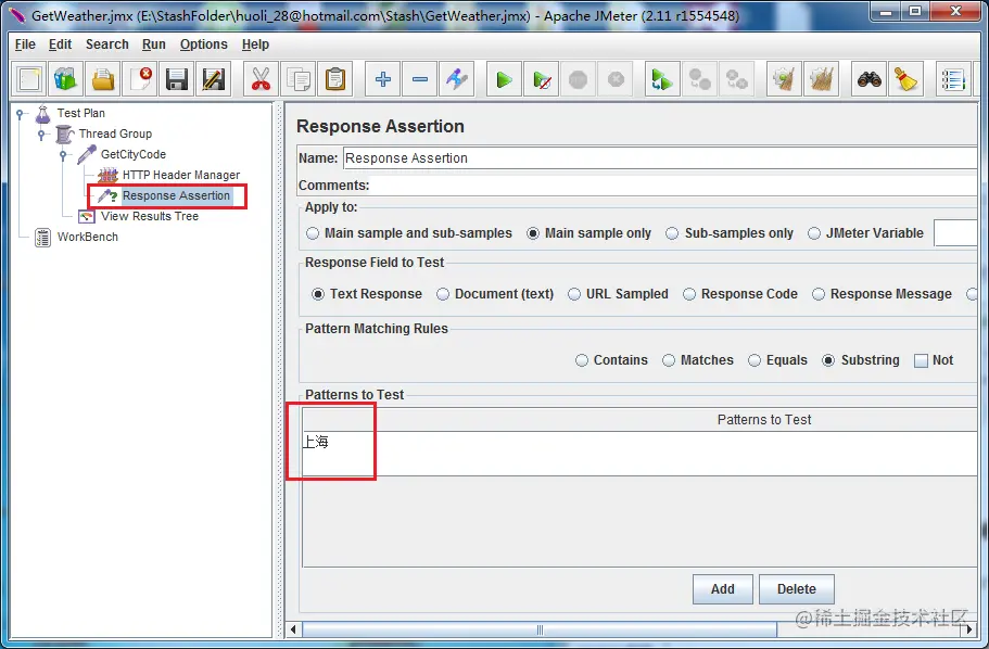 选择HTTP Request, 右键 Add-> Assertions -> Response Assertion. 添加 Patterns To Test