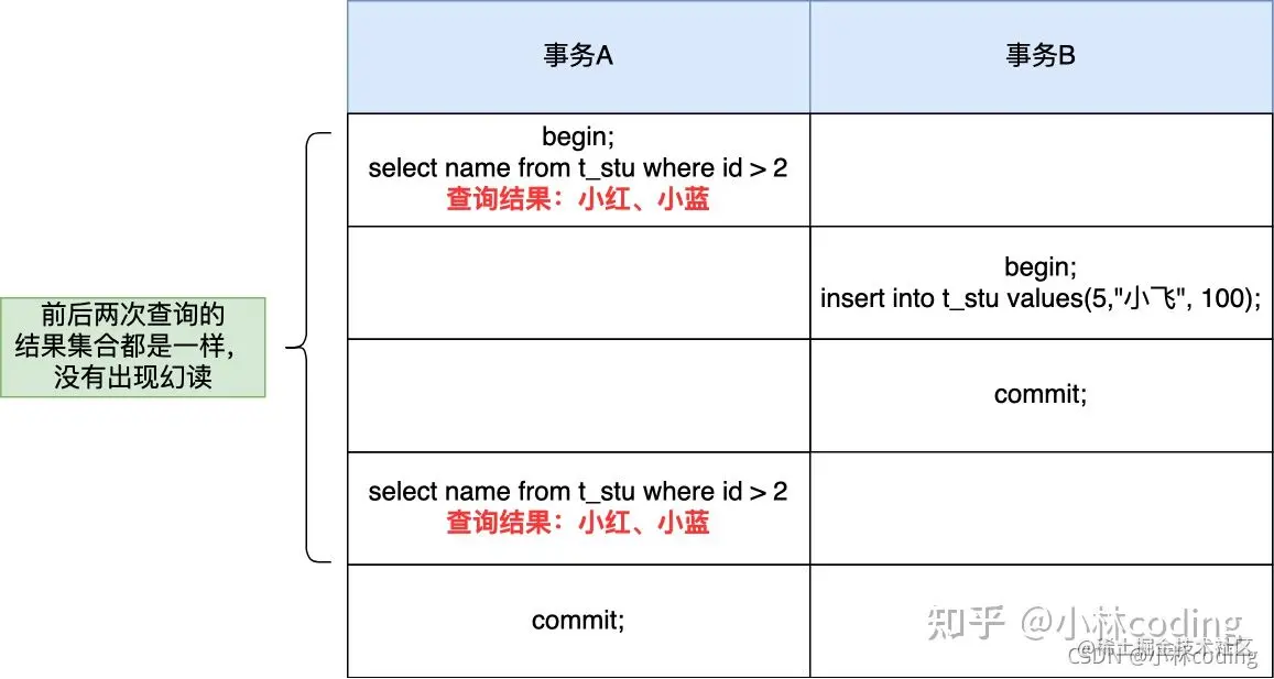 从这个实验结果可以看到,即使事务 B 中途插入了一条记录,事务 A 前后两次查询的结果集都是一样的,并没有出现所谓的幻读现象。