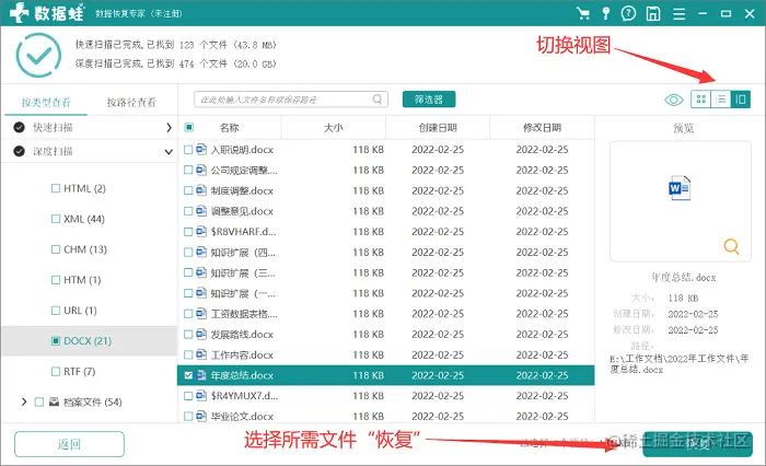 恢复步骤: 扫描结果出来后,大家可以在左侧看到扫描出来的各种文件类型,找到你想要找回的那个类型(也可以通过搜索框快速查找),找到文件类型后可以先通过视图切换来查看具体信息大小。确认选择后即可开始“恢复”。