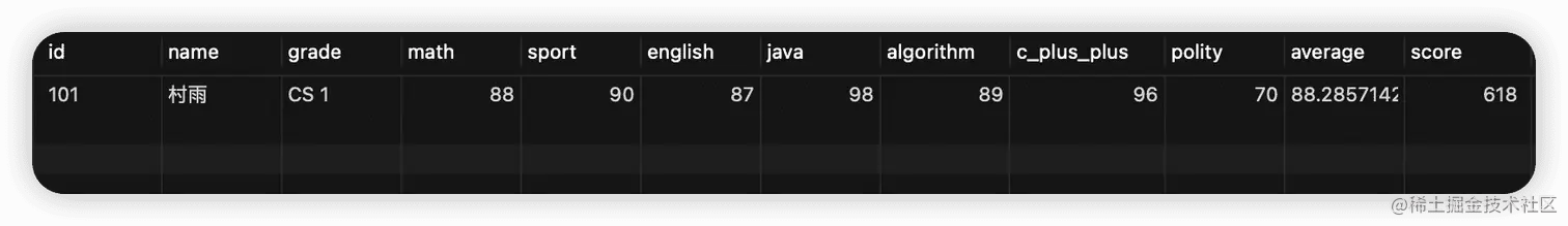 INSERT INTO `student` (`id`, `name`, `grade`, `math`, `sport`, `english`, `java`, `algorithm`, `polity`, `average`, `score`, `c_plus_plus`) VALUES ('101', '村雨', 'CS 1', 88, 90, 87, 98, 89, 70, 88.28571428571429, 618, 96);