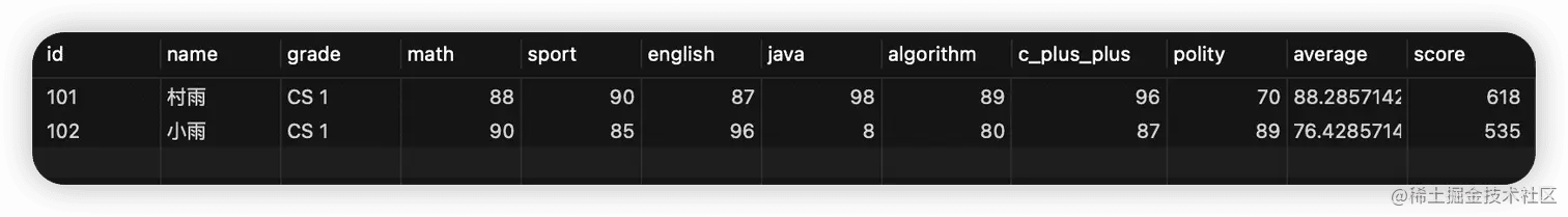 `average` double NOT NULL COMMENT '平均分',
