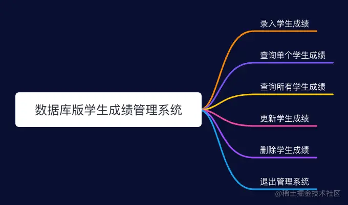 同样的,本次和数据交互版本的学生成绩管理系统具有增删改查成绩等功能。不过相比于之前 SE 版本的功能做了点精简,少了两个小的功能点。因此此次版本的学生成绩管理系统主要分为如下功能: